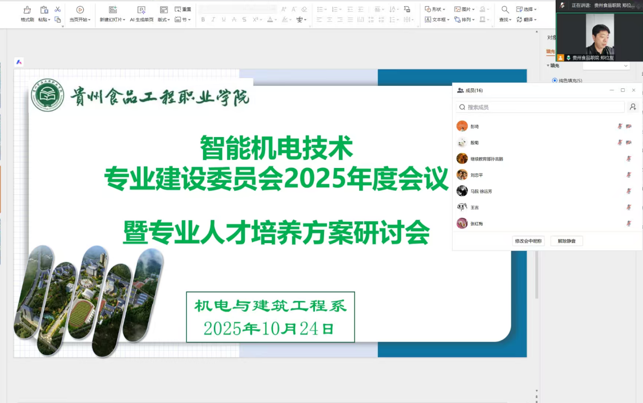 机电与建筑工程系于2025年10月23日通过线上会议平台召开了智能机电技术专业建设委员会2025年度会议暨专业人才培养方案研讨会。会议特别邀请了四位行业权威专家:贵州农业职业学院机电系主任、教授杨光龙,中国航天科工集团第十研究院贵州航天乌江机电设备有限责任公司教授级高级工程师张红梅,惠州 TCL 移动通信有限公司维修技术开发经理、二级技师黄建东,贵州磷化集团·瓮福集团机电维修部门经理、正高级工程师、注册监理工程师杨启尧。机电与建筑工程系党总支副书记(主持工作)乔月音出席会议并讲话,会议由机电与建筑工程系副主任(主持工作)郑位友主持。